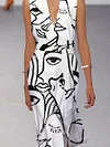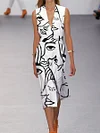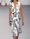 Fashion Art Print V-neck Belted Sleeveless Midi Dress