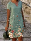 Floral Print Cotton Linen Short Sleeve Mid-Length V-Neck Dress