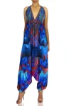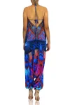 Adjustable size. Made of printed viscose crepe silk, and hand-embellished crystals and metallic beads.